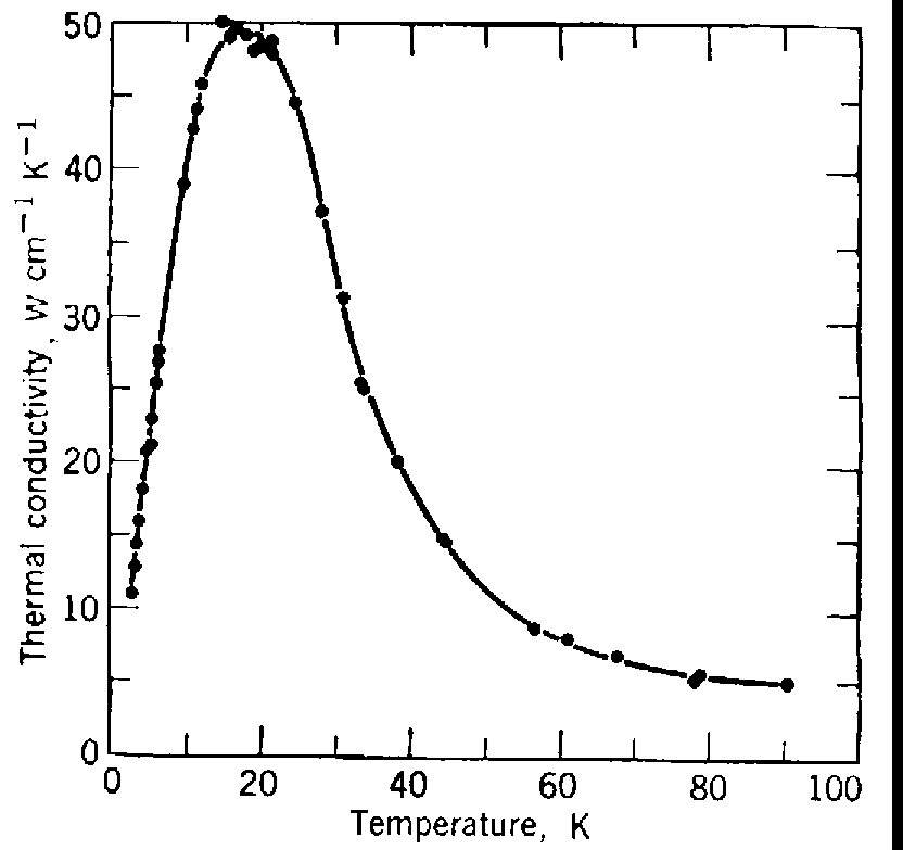 Fig. 1: Thermal conductivity (in W cm-1K-1) vs temperature (in K). The dots are experimental measurements, the curve is a theoretical prediction according to the theory of  ABC.